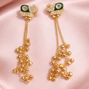 Gold Plated Long Dangle Earrings for Women with Green Enamel & Pearl Beads, Elegant Ethnic Drop Earrings for Wedding & Party Wear