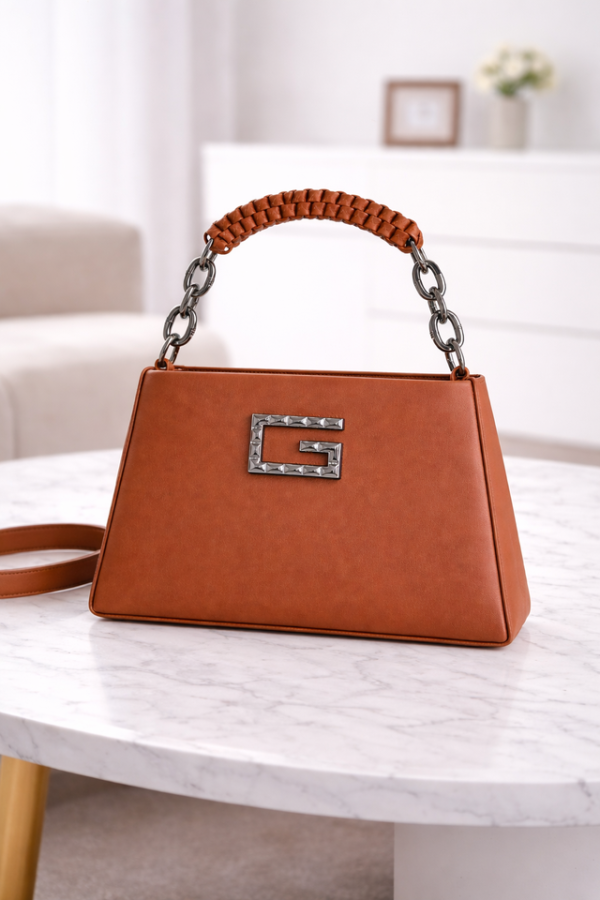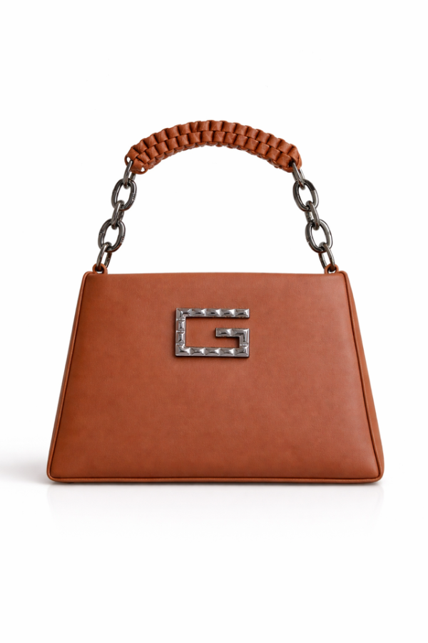 Brown Structured Top-Handle Handbag with Chain Strap and Metallic G Logo