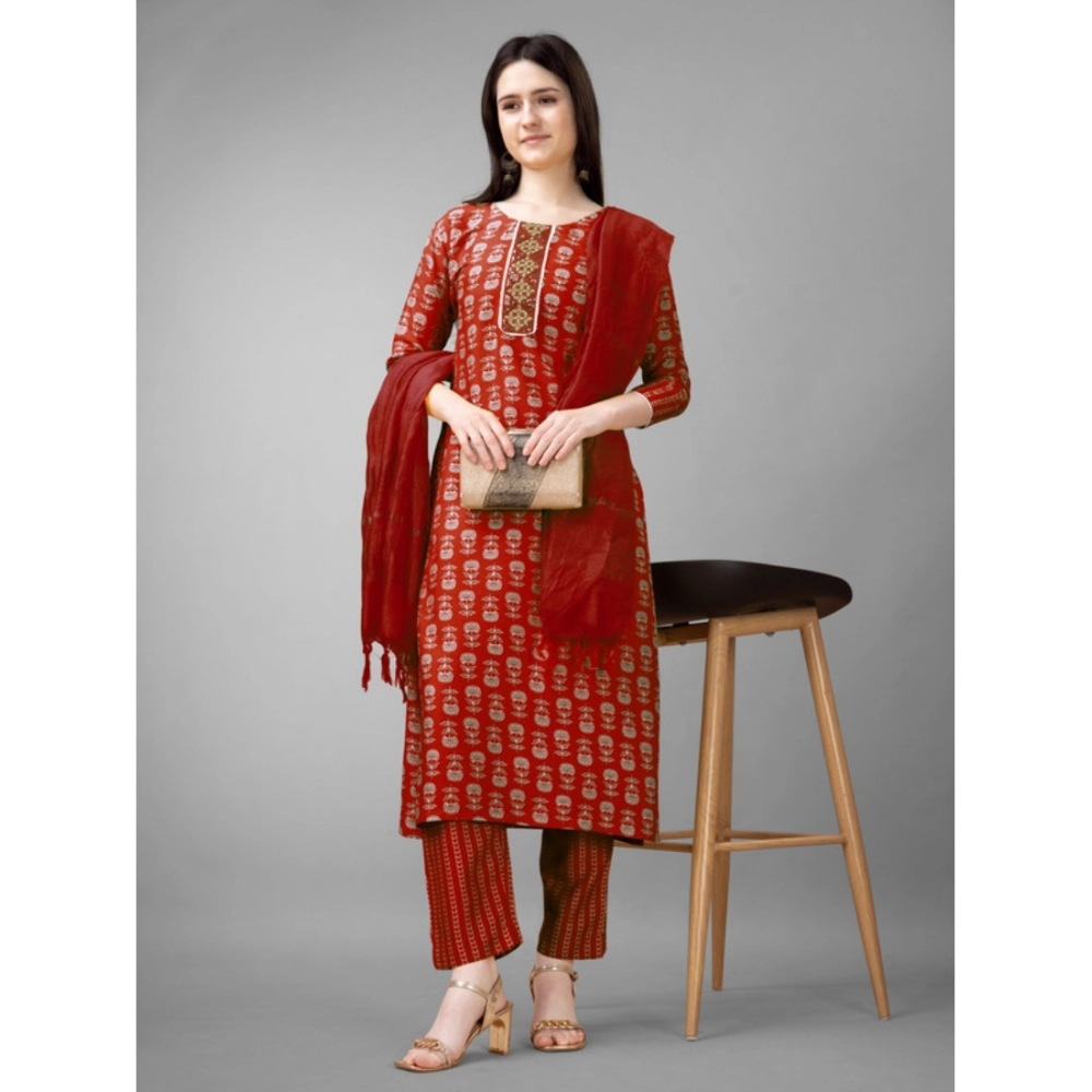 Generic Women’s Casual 3-4 th Sleeve Embroidery Rayon Kurti Pant Dupatta Set (Maroon)