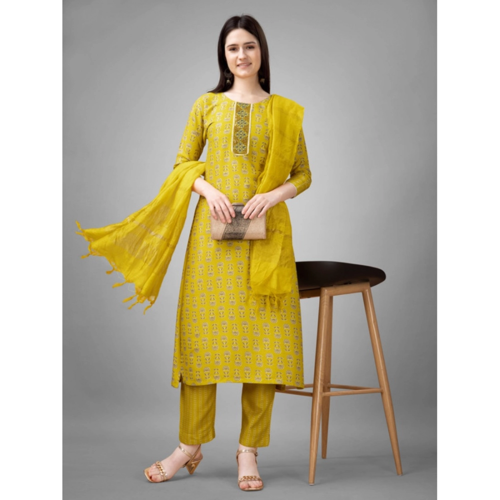 Women’s Casual 3-4 th Sleeve Embroidery Rayon Kurti Pant Dupatta Set