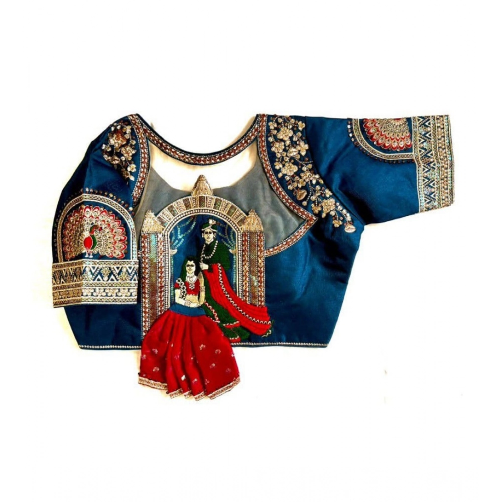 Generic Women’s Shining silk Sequance Round Neck Short Sleeve Readymade Blouse (Teal, Free Size)